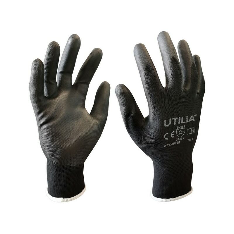 In filato elastico, palmo e dita ricoperti in poliuretano, dorso aerato, polsino elasticizzato.