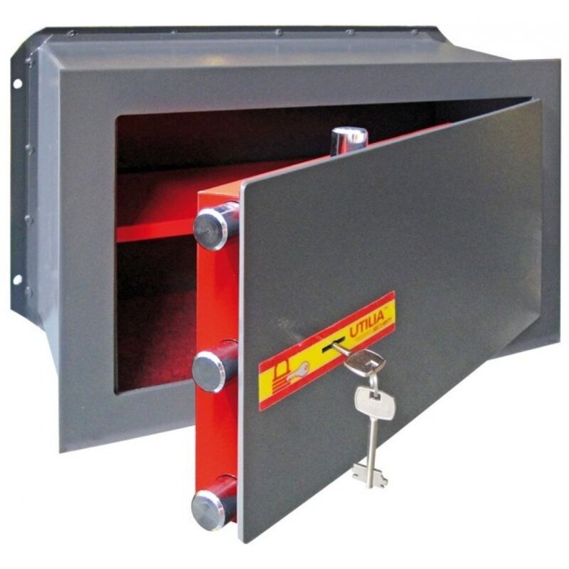 ART. 27557 CASSAFORTE DA MURO UTILIA SECURITY CM. 42x19.5x28H - Solida struttura in acciaio verniciato con polvere epossidica - Serratura a due mandate con chiave a doppia mappa - 2 chiavi - Ripiano interno - 2 catenacci mm. 18 - Completa di tappetino sul fondo