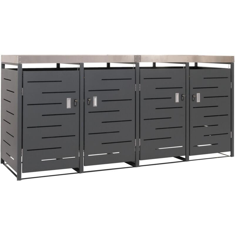 Merce non controllata da reso 4x copribidoni box rifiuti spazzatura con box per piante modello HHG-383 acciaio zincato versione 84x264x125cm colore ANTRACITE Probabilmente conoscete già il problema: i bidoni della spazzatura davanti casa sono una presenza costante, ma esiste una soluzione semplice ed efficace per renderli più apprezzabili! I modelli della nostra serie HHG-383 sono espandibili, indipendentemente dal numero di bidoni della spazzatura che desideri coprire. Se si intende acquistare più copribidoni da affiancare, prestare attenzione alla misura della profondità delle varie versioni. Solo le versioni con la stessa profondità possono essere collegate tra loro mediante viti da posizionare sui lati appositamente preforati. Ogni compartimento è progettato per cassonetti per rifiuti standard con una capacità da 80 a 240 litri. Si raccomanda di misurare il bidone da coprire prima di scegliere la versione compatibile. Lo sportello ha una serratura con combinazione, e può essere