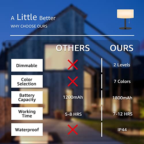 Batteria di grande capacità: la lampada da tavolo wireless offre 6 ore di illuminazione da tavolo alla massima luminosità e fino a 12 ore in condizioni di oscuramento. La lampada da tavolo a LED a batteria è perfetta per interni ed esterni.