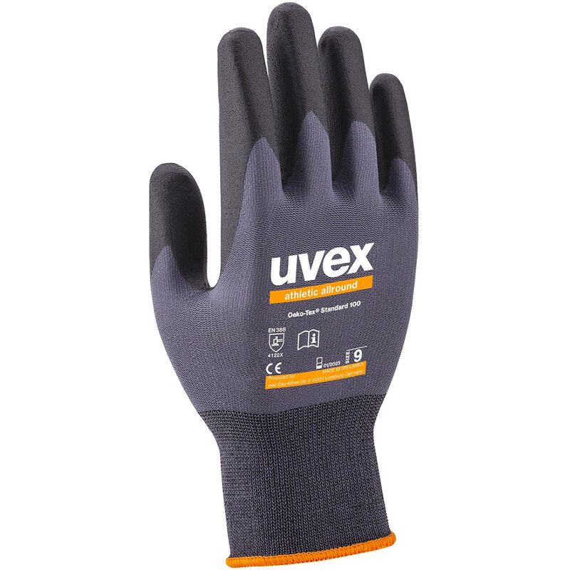I Guanti da lavoro Uvex Athletic Allround 60028 sono dispositivi di protezione ad uso generico, sviluppati dal marchio Uvex per garantire maggiore protezione alle mani del lavoratore che opera in ambienti asciutti e umidi a contatto con materiali appuntiti e potenzialmente taglienti. I guanti Athletic Allround hanno un design “slim fit” per una migliore vestibilità, con rivestimento esterno in poliammide e elastan, che garantisce estrema leggerezza e sensibilità tattile, proprietà ideali nei lavori di imballaggio, di riparazione o smistamento . Ad arricchire la struttura un sottile strato opaco in polimero idrorepellente, con pori aperti su palmo e punta delle dita per assicurare un'ottima traspirabilità e resistenza all'abrasione. La certificazione Oeko-Tex ® Standard 100 rende i guanti Uvex privi di sostanze nocive, acceleranti e allergiche grazie al tessuto dermatologicamente testato con ottima tolleranza cutanea . I guanti protettivi Uvex Athletic Allround 60028 sono DPI c