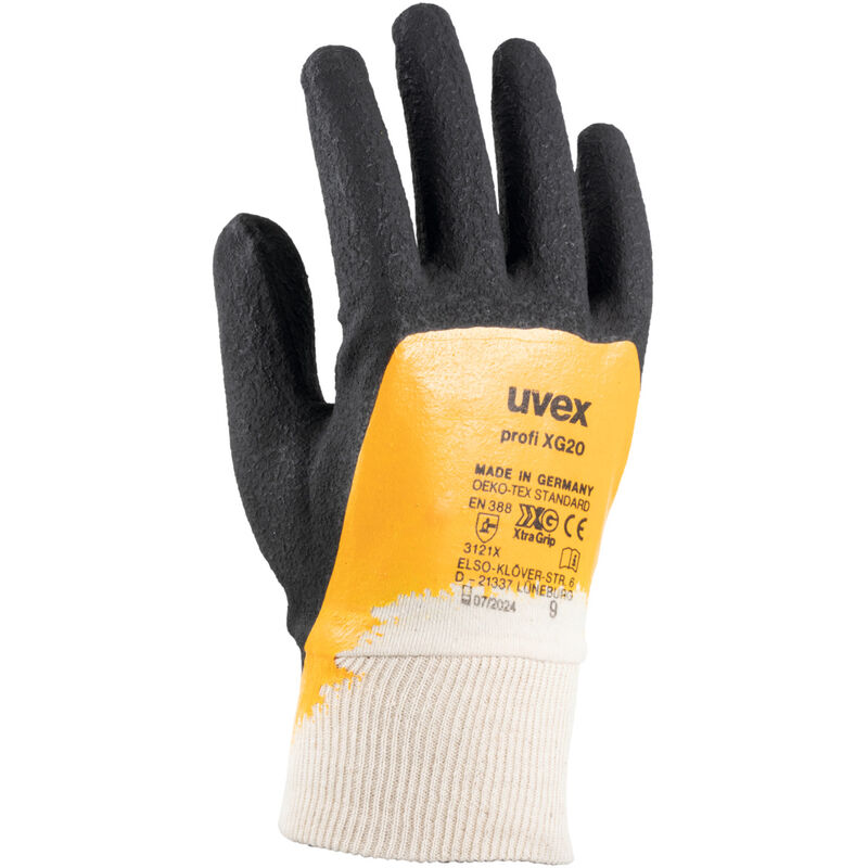 Uvex profi ergo XG20. Guanto in cotone con struttura multistrato interamente in nitrile-caucciù e innovativo rivestimento in schiuma di nitrile con tecnologia uvex Xtra Grip per un'ottima presa sull'olio. Norma: EN 388;