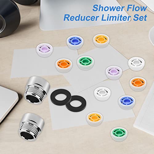 UYDF 2 Set Limitatore Doccia Set, Doccia Riduttore di Flusso Limitatore Set, 1.2/1.5/1.8/2.0/2.2/2.5 GPM Fino al 70% di Acqua Risparmio, per Rubinetto Filtro Acqua Bagno Soffione Cucina Accessori
