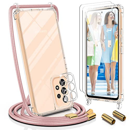 UYMO Trasparente Cover con cordino per SAMSUNG Galaxy A53 5G - con 2 Pezzi Vetro Temperato e Pellicola Fotocamera protettiva,Custodia con Laccio Collana Tracolla Regolabile catena Case,Oro rosa