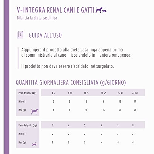 V-INTEGRA RENAL è l'integratore di vitamine e minerali formulato per bilanciare le diete casalinghe di cani e gatti che richiedono una restrizione di fosforo. Non contiene fosforo, l'apporto di tale nutriente deriva quindi solo dagli ingredienti che compongono la dieta. L'integratore apporta livelli di sodio contenuti, contiene vitamina C e vitamina E ad azione antiossidante, è arricchito in taurina. Non contiene proteine quindi è adatto a soggetti con allergia alimentare.