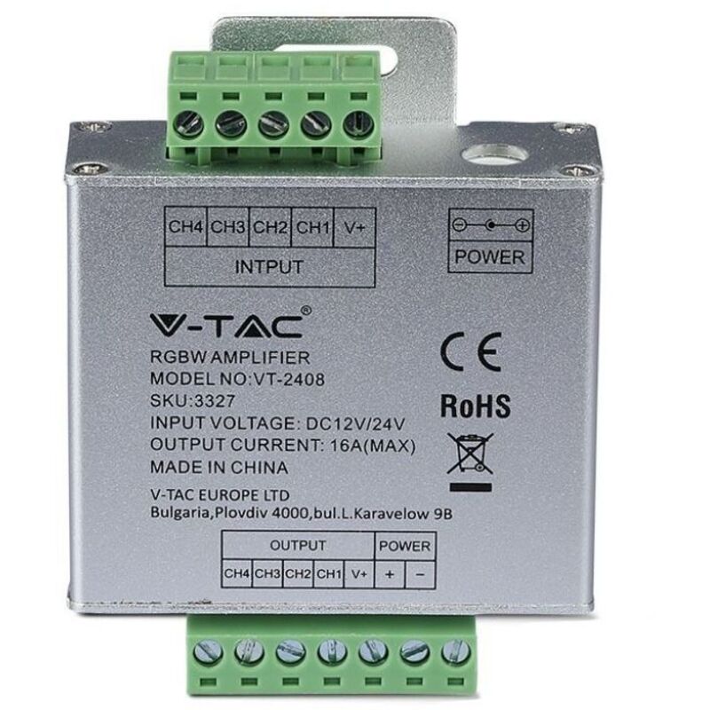 Amplificatore di segnale V-TAC VT-2408 per strisce a LED RGB+W da 12/24V. Consente la gestione, con un singolo controller rgb (non incluso), di strisce led pi lunghe di 5 metri. Superati i 5 metri, per poter continuare ad utilizzare un solo controller, occorre inserire un amplificatore di segnale, con relativo alimentatore adeguato all'amperaggio della striscia. Questo amplificatore ha un Voltaggio di 12-24V, una tensione di uscita massima di 12A e si connette con la striscia LED tramite morsetti a vite. Per poterlo utilizzare necessita di un alimentatore (non incluso) che pu essere connesso all'amplificatore anche tramite Jack 2.1 Plug&Play. Voltaggio: 12/24V (alimentatore non incluso). Tensione di uscita: 12 A (max.) Output: 3 canali Tipo connessione: Morsetti a vite - Jack 2.1 Plug&Play. Dimensione: 150x25x65mm Peso: 100g