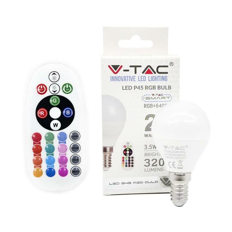 Lampadina a LED 3.5W E14 P45 Controllo luminosit RF attenuabile RGB + 3000K SKU: 2775: VT: VT-2234 Caratteristiche del prodotto .80% di consumo energetico in meno rispetto alle lampadine standard .Lunga durata .Nessuna emissione di radiazioni UV e radiazioni non ionizzanti .Accensione immediata, nessun tempo di riscaldamento .Bassa potenza termica .Direttamente sostituibile alle lampade ad incandescenza tradizionali Installazione .Aree Commerciali e Residenziali .Hotel, Bar .Stand espositivi .Lampadari .All aperto, esclusivamente all'interno di apparecchi idonei.~ Specifiche tecniche ~: Informazione generale = ~:Attacco=E14~:Tipo Lampadina=P45~:Tipo LED=SMD~:Vita media=30 000 h~: Dati elettrici = ~:Potenza=3.5W~:Potenza EQV. a incandescenza=30W~:Tensione=AC: 220-240V~:Frequenza =50Hz~:Fattore di potenza=>0.4~: Dati tecnici Luce = ~:Colore della luce =Bianco caldo~:Temperatura di colore=RGB + 3000K~:Flusso luminoso =320 lm~:Indice di resa cromatica Ra=>80~:Fascio