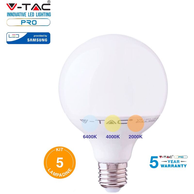 Lampadina LED V-Tac PRO VT-288 con potenza di 18W e attacco E27 . Lampadina con tecnologia LED SMD con chip Samsung, forma Globo G120 in materiale termoplastico e copertura opaca. Fascio luminoso di 200° e flusso luminoso di 2000 lm. Questa lampadina adalta luminosità ha rapporto di 111 lm/W. La potenza di 18W è equivalente a 124W di una lampadina a incandescenza. I prodotti V-Tac PRO utilizzano chip LED Samsung di nuova generazione, garantiscono una durata di 30000 ore, un'affidabilità superiore alla media e una più elevata efficienza energetica. Questo modello di lampadina è disponibile con 3 diverse temperature colore: Luce Bianca Calda 3000K (SKU 123), Bianca Naturale 4000K (SKU 124) e Bianca Fredda 6400K (SKU 125). Questo prodotto ha una garanzia di 5 anni. KIT da 5 LAMPADINE VT-288 Il kit include 5 lampadine identiche. Specifiche tecniche Informazione generale Attacco: E27 Tipo Lampadina: G45 Tipo LED: SAMSUNG Chip Vita media: > 30 000 h Dati elettrici Potenza: 18W Potenza