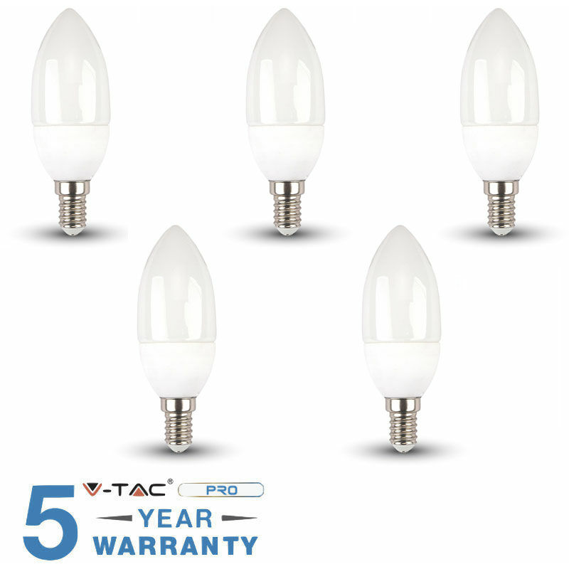 5 LAMPADINE LAMPADINA LED E14 FIAMMA 4 W 30 W V-TAC CANDELA Lampadine LED E14 SMD con Fascio luminoso di 200° e Flusso luminoso di 320 lm. 4W corrispondenti a 30W. Disponibile con Luce Bianca Calda (2700K), Naturale (4000K) e Fredda (6000K). Dimensioni: Ø 37mm x H 100mm. Lampadina LED V-Tac VT-1818 con potenza di 4W e attacco E14. Forma candela in materiale plastico bianco e Alluminio. LED SMD con fascio luminoso di 200°, flusso luminoso di 320 lm e un rapporto di 80 lm/W. La potenza di 4W è equivalente a 30W di una lampada a incandescenza. Questo modello di lampadina è disponibile con 3 diverse temperature colore: Luce Bianca Calda 2700K (SKU 4216), Bianca Naturale 4000K (SKU 4166) e Bianca Fredda 6000K (SKU 4122). Dimensioni: Ø 37 x 100 mm.