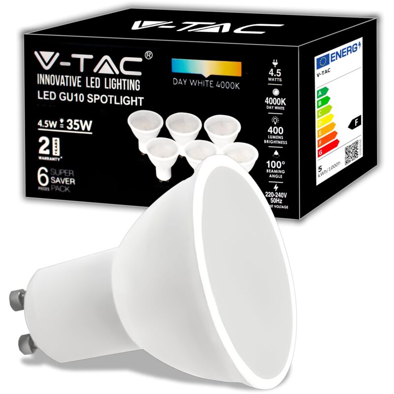 V-TAC 6x Lampadine LED GU10 4.5W (Equivalenti a 35W) - 400 Lumen - Alta Luminosità - Faretto Led GU10 - Massima Efficienza e Risparmio Energetico - Luce Bianca Calda 3000K - Box 6 Pezzi