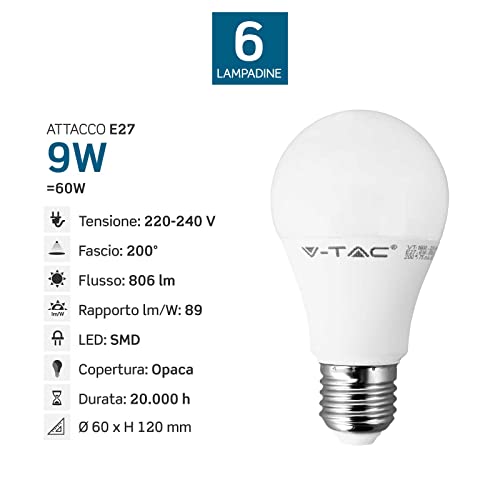 V-TAC 6 pezzi, Lampadine LED E27, 9W (806 lumen equivalenti a 60W), Forma: Bulbo, Luce Bianco Caldo, Naturale o Freddo (Bianco Caldo)