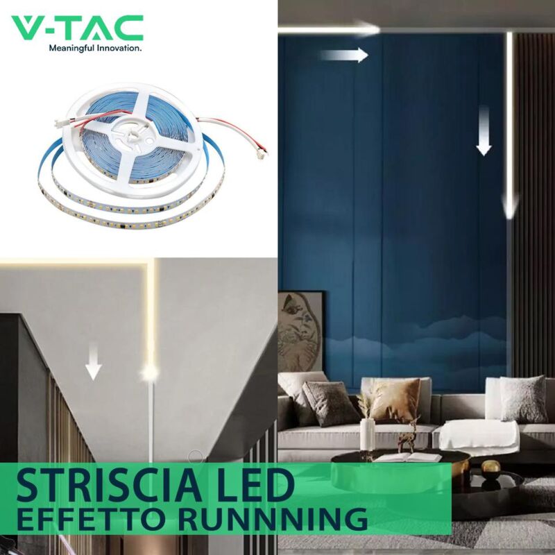 LED Striscia Running 2835 120 10W 24V 4000K SKU: 23608: VT: VT-2835 Specifiche tecniche: Informazione generale =:Tipo LED=SMD 2835: Dati elettrici =:Potenza/m=10W:Tensione=DC:24V: Dati tecnici luce =:Fascio Luminoso=120:Colore della luce=Bianco naturale:Temperatura di colore=4000K:Flusso luminoso/m=800 lm:Indice di resa cromatica Ra=>80: Funzionalit =:IP Protezione=IP20:Segni di taglio=Cut only on the given cut line between the copper dots.~:Tempo innesco 100%=0.001 secondo~:Stabilità del colore