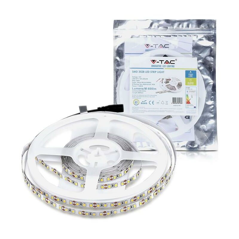 Striscia strip led ip20 7.2watt led smd 3528 bianco caldo 5 mt G alimentazione 12 volt dc non dimmerabile apertura fascio luminoso 120° gradazione luce 3000 k lumen 3000 potenza 7,2 watt a metro