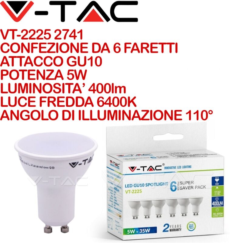 Confezione da 6 faretti LED da 5W in grado di sviluppare un'intensità luminosa di 400 Lumen che può essere paragonata ad una lampadina tradizionale da 35W. Attacco GU10, dimensioni 50 x 58 mm ed un'efficienza energetica di classe A+. Costruita in materiale termoplastico, ha una finitura satinata ed un irraggiamento della luce di 110°. Garantita 2 anni e con una durata di 30000 ore è un'ottima soluzione in qualsiasi contesto. EAN 3800157645317 Colore della luce 6400K Potenza 5W Tipo di Attacco GU10 Flusso luminoso 400 lm Tipo di led SMD Durata 30000 ore Tensione AC: 220-240V Angolo di illuminazione 110° CRI >80 Materiale Plastica Valutazione IP IP20 Cicli On/Off 15000 Dimensioni 50 x 58 mm Classe di efficienza energetica A+ Modello VT-2225 2741 Marca V-TAC Codice prodotto 02.031.0306602