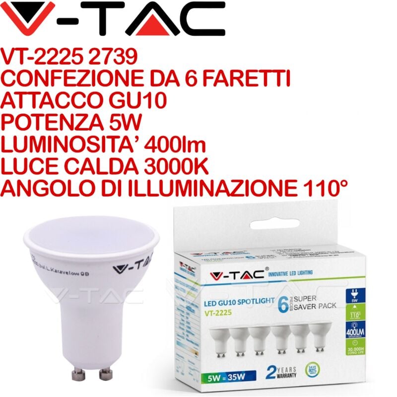 Confezione da 6 faretti LED da 5W in grado di sviluppare un'intensità luminosa di 400 Lumen che può essere paragonata ad una lampadina tradizionale da 35W. Attacco GU10, dimensioni 50 x 58 mm ed un'efficienza energetica di classe A+. Costruita in materiale termoplastico, ha una finitura satinata ed un irraggiamento della luce di 110°. Garantita 2 anni e con una durata di 30000 ore è un'ottima soluzione in qualsiasi contesto. EAN 3800157645294 Colore della luce 3000K Potenza 5W Tipo di Attacco GU10 Flusso luminoso 400 lm Tipo di led SMD Durata 30000 ore Tensione AC: 220-240V Angolo di illuminazione 110° CRI >80 Materiale Plastica Valutazione IP IP20 Cicli On/Off 15000 Dimensioni 50 x 58 mm Classe di efficienza energetica A+ Modello VT-2225 2739 Marca V-TAC Codice prodotto 02.031.0306304