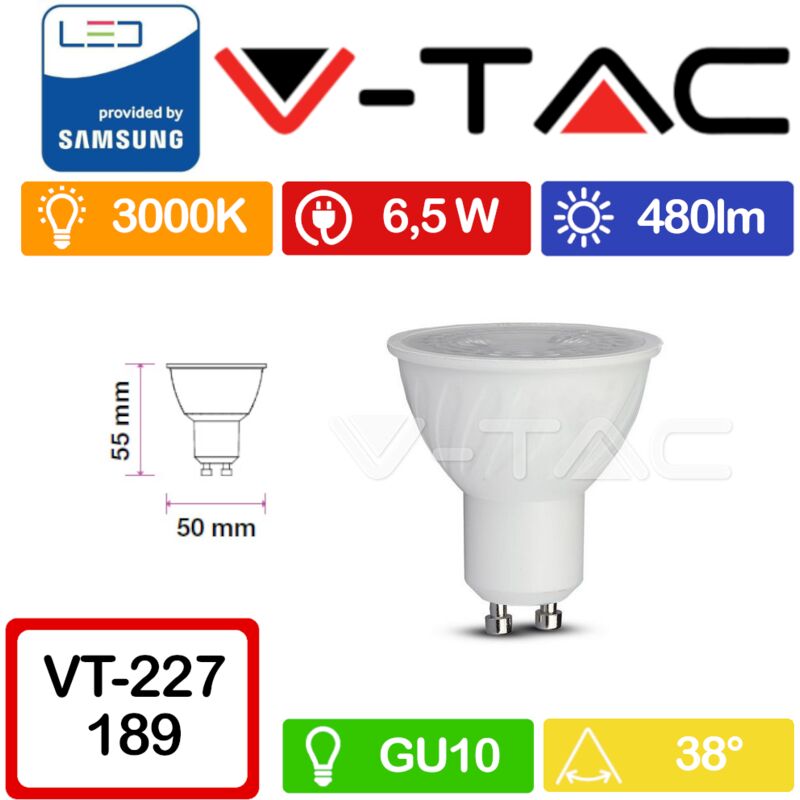 Faretto LED da 6,5W in grado di sviluppare un'intensità luminosa di 480 Lumen che può essere paragonata ad una lampadina tradizionale da 60W. Attacco GU10, dimensioni 50 x 55 mm ed un'efficienza energetica di classe F. Costruita in materiale termoplastico, ha una finitura satinata ed un irraggiamento della luce di 38°. Garantita 5 anni e con una durata di 30000 ore è un'ottima soluzione in qualsiasi contesto. EAN 3800157631549 Colore della luce 3000K Potenza 6.5W Tipo di Attacco GU10 Flusso luminoso 480 lm Tipo di led Chip Samsung Durata 30000 ore Tensione AC: 220-240V Angolo di illuminazione 38° CRI >80 Materiale Plastica Valutazione IP IP20 Cicli On/Off >20000 Dimensioni 50 x 55 mm Classe di efficienza energetica F Modello VT-227 189 Marca V-TAC Codice prodotto 02.031.0307300