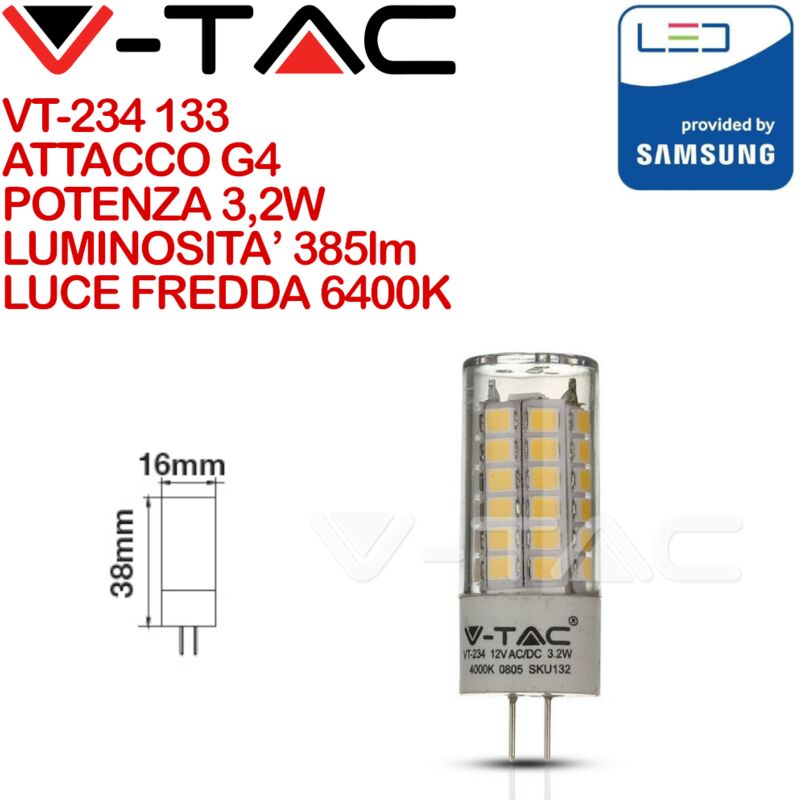 Faretto LED da 3,2W in grado di sviluppare un'intensità luminosa di 385 Lumen. Attacco G4, dimensioni 16 x 38 mm ed un'efficienza energetica di classe E. Costruita in materiale termoplastico, ha una finitura trasparente ed un irraggiamento della luce di 300°. Garantita 5 anni e con una durata di 30000 ore è un'ottima soluzione in qualsiasi contesto. EAN 3800157639408 Colore della luce 6400K Potenza 3.2W Tipo di Attacco G4 Flusso luminoso 385 lm Tipo di led Chip Samsung Durata 30000 ore Tensione AC: 220-240V Angolo di illuminazione 300° CRI >80 Materiale Plastica Valutazione IP IP20 Cicli On/Off >20000 Dimensioni 16 x 38 mm Classe di efficienza energetica E Modello VT-234 133 Marca V-TAC Codice prodotto 02.031.0604600
