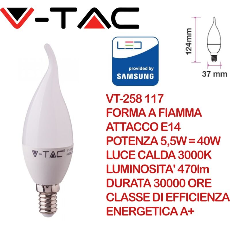 Lampadina a LED da 5.5W ed in grado di sviluppare un'intensità luminosa di 470 Lumen che può essere paragonata ad una lampadina tradizionale da 40W. Con attacco E14, forma a fiamma e dimensioni 37 x 124 mm, ha un efficienza energetica di classe A+. Costruita in termoplastica questa lampadina a LED ha una finitura opaca che le permette un irraggiamento della luce di 200°. Garantita 5 anni e con una durata di 30000 ore è un'ottima soluzione in qualsiasi contesto che va dalla semplice abitazione ad alberghi e ristoranti. EAN 3800157637169 Colore della luce 3000K Attacco E14 Tipo lampadina Candela fiamma Tipo led Chip Samsung Durata 30000 ore Potenza 5,5 W Potenza equivalente 40 W Tensione AC: 220-240V Angolo di illuminazione 200° Flusso luminoso 470 lm CRI >80 Materiale Plastica Protezione IP IP20 Cicli On/Off 15000 Temperatura di lavoro -20°C + 45°C Dimensioni 124 x 37 mm Classe di efficienza energetica A+ Modello 117 VT-258 Marca V-TAC Codice prodotto 02.001.1706300