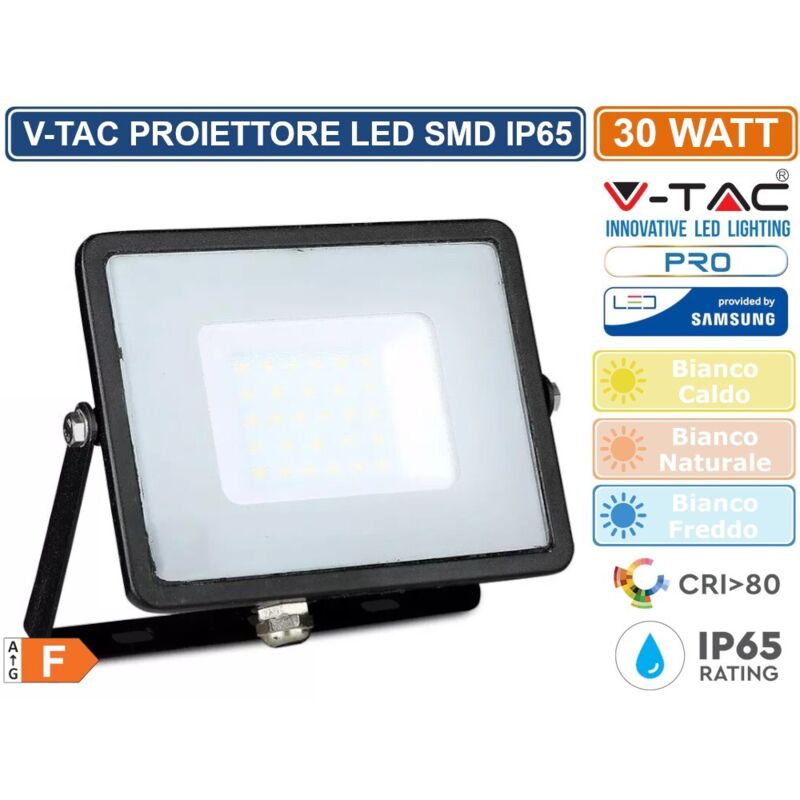 V-TAC PRO Faro ultrasottile Chip LED Samsung SMD nero lucido 30W, luce bianco caldo 3000K 100° 2.400LM A+ esterno IP65 SMD VT-30 - SKU 400 Il faro a Led è dotato di filo senza spina, per collegamento diretto in scatola di derivazione. La struttura in alluminio sottile SLIM, dal colore nero, rende questo faro adattabile in ogni situazione. Ottimo in sistemi di videosorveglianza e sicurezza, dato il basso assorbimento può essere lasciato sempre acceso. Inoltre è resistente all'acqua (IP65) e quindi può essere installato anche in spazi esterni come: giardini, cortili, ville ecc.. Il faro è completo di staffa per un facile montaggio a muro. Questo prodotto ha una garanzia di 5 anni. Chip LED: Chip LED Samsung SMD Tensione / Frequenza: AC 220-240V/50Hz Tecnologia dei Led: SMD Potenza: 30W Potenza (equivalente ad alogena): ~ 200W Colore della luce: Bianco caldo (3.000K) Flusso luminoso: 2.400Lm - 80 LM/W Apertura fascio luminoso: 100° Grado di protezione IP: Waterproof IP65 Vita media