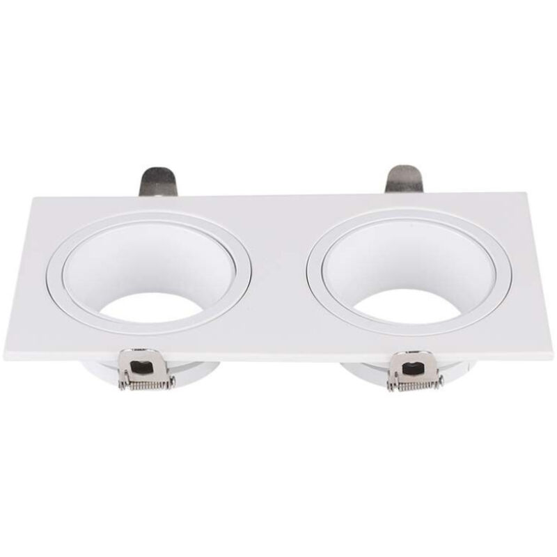 V-TAC Portafaretto incasso doppio in policarbonato e metallo rettangolare con interni rotondi BIANCO per n.2 lampadine faretto SPOT 1*GU10 - GU5.3, completo di sistema ferma faretto Mod. 10298 Adatto per negozi ed esposizioni o per larredamento in casa. Installabile solo in ambienti interni Waterproof IP20. Utilizzabile con faretti LED o incandescenza con diametro di 50mm. Nota: Adattatore per faretti GU10 - LAMPADINA NON INCLUSA. Materiale: Policarbonato - METALLO Installazione: Incasso TIpo: Doppio faretto GU10 Colore: Bianco Forma: rettangolare Orientabilità: NO Aggancio a molla: SI Dimensioni (esterne): 175x88x30mm Dimensioni montaggio foro: 160x75mm Compatibilità: Lampadine GU10
