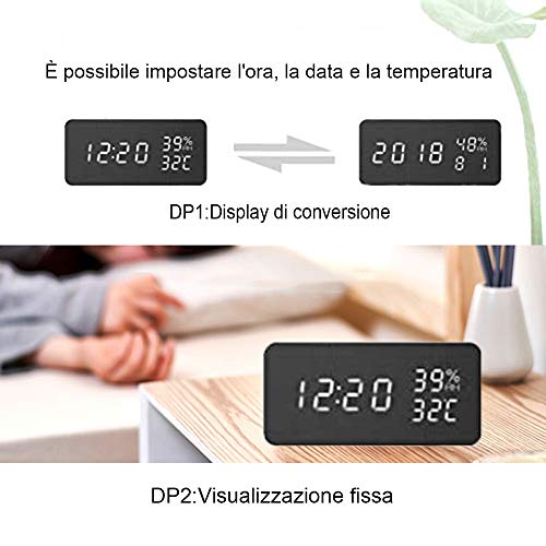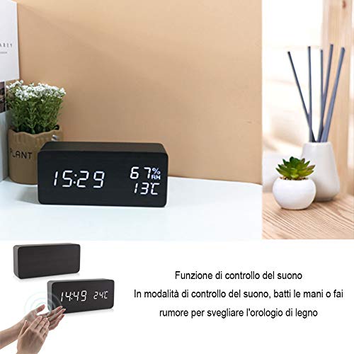 VABOO Sveglia in Legno, Sveglia Digitale da Comodino, Orologio da Tavolo con Display Temperatura umidità Ore, 3 Livelli di Luminosità, Controllo Vocale,Orologio da Comodino Doppio Alimentatore