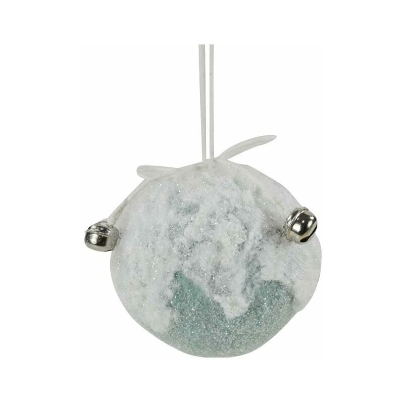 Sfera di natale Skandy da appendere all'albero di natale, decorata con campanellini, innevata e con glitter. Colore: Verde chiaro glitter e bianco Dimensioni: Diamentro 10 cm