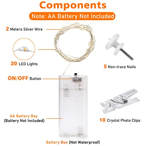 【20 LED e 10 clip e 5 chiodi】 Le nostre clip per catene luminose per foto hanno 20 LED. Ogni LED 10 cm, per un totale di 2 m di lunghezza. Dotato di 10 clip trasparenti per visualizzare più immagini, cartoline, stampe, grafiche per bambini, disegni, detti e altro. Viene fornito con 5 chiodi antitraccia per appendere e fissare le luci al muro, alla porta, agli alberi di Natale, alla casa e alla camera da letto.