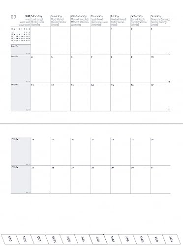Agenda mensile aperta in italiano, con presentazione di un mese su 2 pagine. Include 4 pagine di note a righe