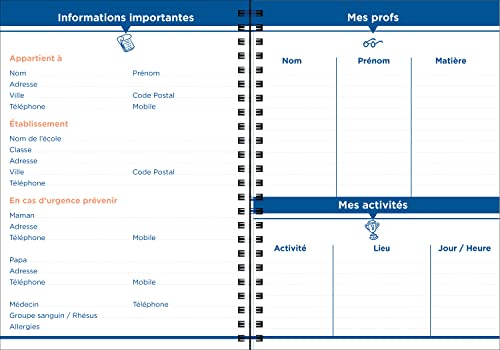 Contiene pagine di informazioni pratiche (tabelle coniugate, moltiplicazioni, carte geografiche, vocabolari inglesi, ecc.)