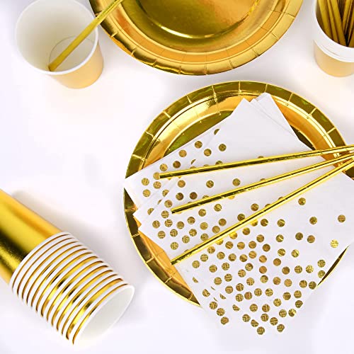 VAINECHAY 120pcs Stoviglie USA e Getta Compleanno Piatti di Carta Festa Paglia Coppa Bicchiere Carta Tovagliolo per Matrimoni Feste Baby Shower Natale Oro