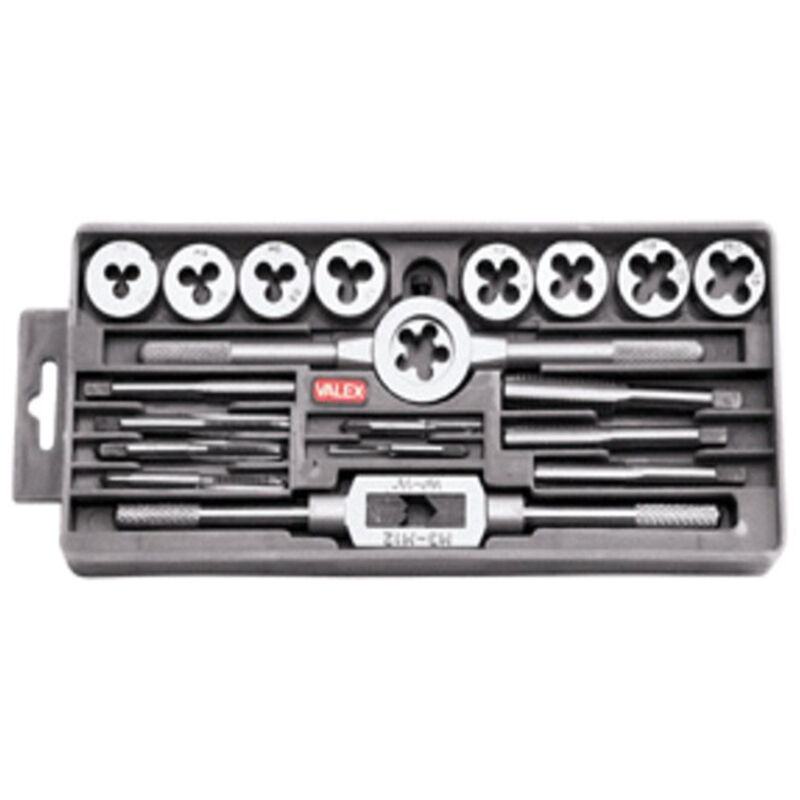 9 maschi e filiere filettatura metrica ISO passo grosso misure M3x0,50-M4x0,70-M5x0,80-M6x1,00-M7x1,00-M8x1,25-M9x1,25-M10x1,50-M12x1,75 - 1 giramaschi - 1 portafiliere - In acciaio al cromo, per lavori su metallo duro fino all'acciaio inox.