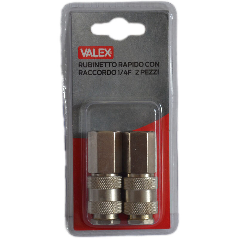 Rubinetto rapido - Marca Valex - Con raccordo 1/4F - In acciaio - Blister da 2 pz Rubinetto rapido ad aria compressa Valex con raccordo da 1/4F, in acciaio, blister da 2 pezzi.