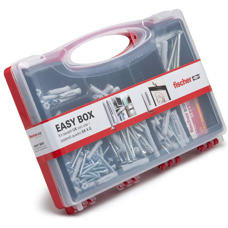 Terminati i fissaggi, la valigetta fischer può essere riutilizzata. Valigetta Fischer Easy box Tasselli UX 272Pz La valigetta fischer Redbox in plastica di alta qualità e resistente agli urti, offre un ottimo rapporto prezzo / prestazioni. Il kit contiene le migliori gamme selezionate di tasselli e viti. La combinazione dei componenti all'interno, garantisce sempre la soluzione di fissaggio più sicura per ogni applicazione in casa. Grazie al coperchio trasparente, inoltre, il contenuto può essere scelto a colpo d'occhio. Terminati i fissaggi, la valigetta fischer può essere