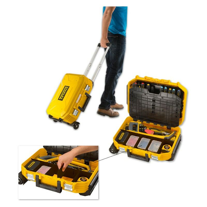 Dettagli: Robusto e compatto: Corpo e coperchio in polipropilene rinforzato con fibra di vetro Chiusure metalliche grandi e resistenti alla corrosione Completo e modulare: accesso simultaneo a TUTTI gli strumenti Il fondo della valigia: schiuma preformata per prese, chiavi... Una struttura rimovibile a fisarmonica: Una separazione fissa tra il fondo e la parte del cavalletto: mantiene gli strumenti in posizione durante il trasporto e può essere utilizzata come superficie di lavoro aggiuntiva Stabile e sicuro: Nessun rischio di ribaltamento grazie ai piedini a scomparsa automatica che bloccano il coperchio in posizione aperta. Possibilità di inserire un lucchetto (non fornito) Portaetichette personalizzabile Comfort e facilità d'uso: Rivestimento in gomma spessa dell'impugnatura Manico lungo, ergonomico e telescopico in alluminio a 3 posizioni Ruote di 75 mm di diametro (a rulli) montate su cuscinetti a sfera per la massima manovrabilità Attrezzature: Contiene: 1-33-552 MISURA