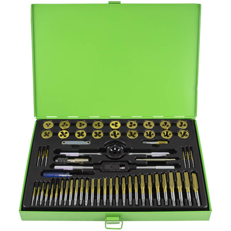 Contenuto: / 1 tipo maschio NPT: 1/8-27 / 1 tipo filettatura maschio NPT: 1/8-27 / 1 portamaschi: M4~M12 / 1 portamaschi tipo T: M3~M6 / 1 portamatrice: 25 mm O/D / 1 cacciavite / 1 set di calibri per filettatura / 17 maschi: 2x0,4, 3x0,6, 3x0,5, 3,5x0,6, 4x0,75, 4x0,7, 5x0,8