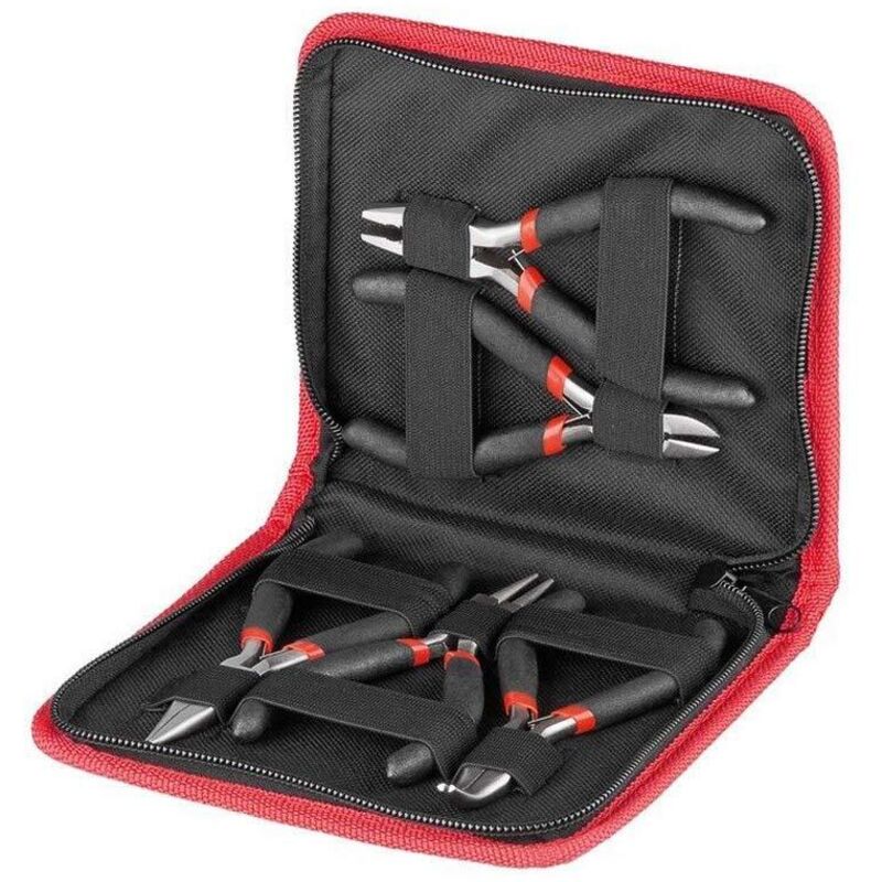 Set di pinze nichelate 5 modelli Maniglia isolata Nichelato Con molla di ritorno Pratica valigetta per il trasporto. Contenuto: pinza piatta 125 mm pinza da taglio a filo 125 mm Pinza curva da 125 mm pinza a naso piatto 45° 125mm ad arco 125 Pinza ad ago