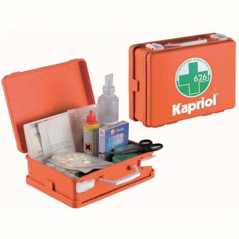 Valigetta prontosoccorso kapriol ALL2 Contenuto a norma del DM 388 del 15/07/2003 allegato 2 Ideale per mezzi di lavoro e per chi svolge la propria attività al di fuori della sede produttiva Destinatari: aziende con meno di tre lavoratori che non rientrano nel gruppo A Valigetta realizzata in polipropilene antiurto Supporto per attacco a parete Chiusura con due clips rotanti Maniglia per trasporto Dimensioni: 250x190x90 mm, peso: 1,40 kg CONTENUTO 1 Copia Decreto Min 388 del 15.07.03 - 2 Paia guanti sterili - 1 Flacone disinfettante 125 ml IODOPOV IDONE al 10% iodio PMC - 1 soluzione fisiologica sterile 250 ml CE - 1 Busta compressa garza sterile cm 18x40 - 3 Buste compressa garza sterile cm 10x10 - 1 Pinza sterile - 1 Confezione di cotone idrofilo - 1 PLASTOSA N 10 cerotti assortiti - 1 Rocchetto cerotto adesivo m 5x2,5 cm - 1 Benda di garza da m 3,5x10 cm - 1 Paio di forbici tagliabendaggi cm 14,5 DIN 58279 - 1 Laccio emostatico - 1 ICE PACK ghiaccio istantaneo monouso - 1 Sacchetto