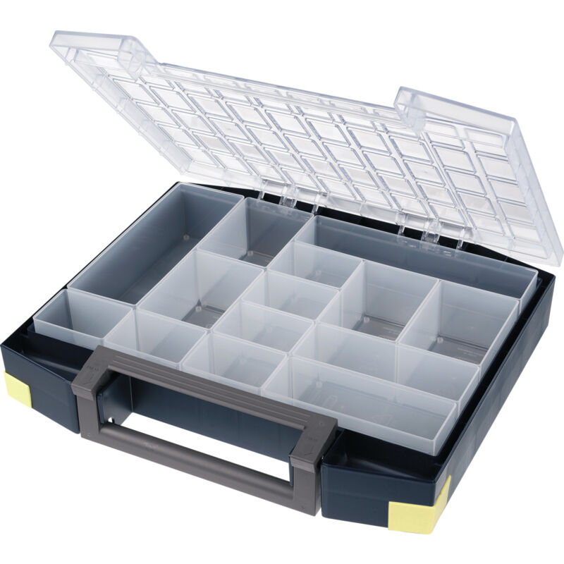 Corpo della valigetta a doppia parete in PP e coperchio in policarbonato garantiscono elevata portata e stabilità. Meccanismo di chiusura pratico per l'uso con una mano sola, maniglia con chiusura di sicurezza. I moduli profilati nel coperchio e nel fondo impediscono il rovesciamento degli scomparti intercambiabili e del contenuto durante il trasporto. Collocamento: numero di scomparti Lunghezza × Larghezza × Altezza: 6 pz. 79×55×69 mm;