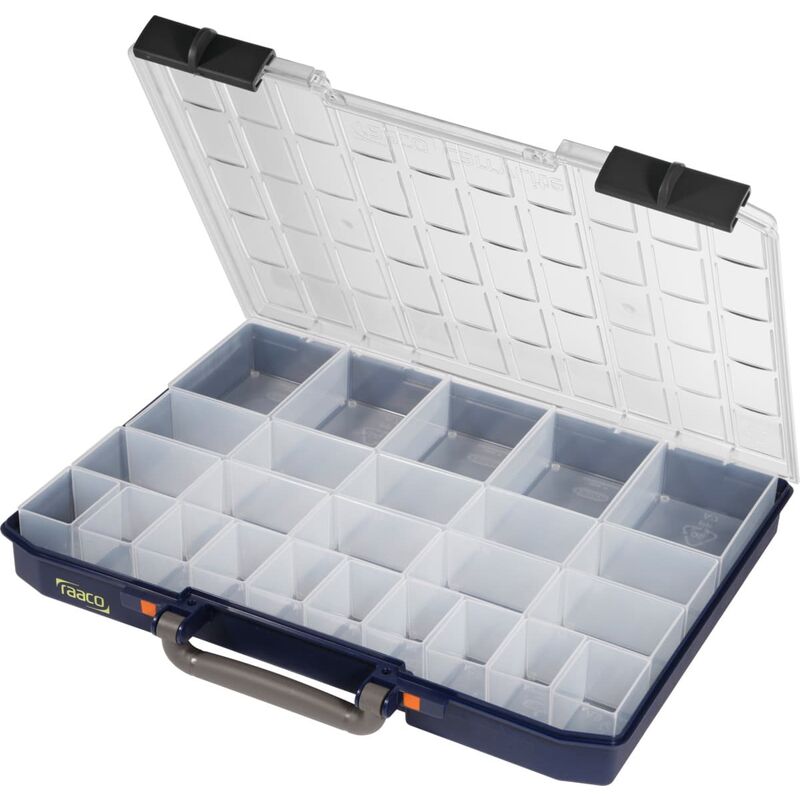 DescrizioneEsecuzione:Corpo valigia in PP, coperchio in policarbonato. Forti cerniere multipunto assicurano stabilità, mentre 2 chiusure scorrevoli bloccano il coperchio trasparente. I moduli profilati nel coperchio impediscono il rovesciamento degli scomparti intercambiabili e del contenuto durante il trasporto.Collocamento:numero di scomparti Lunghezza × Larghezza × Altezza: 10 pz. 55×39×47 mm10 pz. 79×55×47 mm5 pz. 109×79×47 mmDati tenici Dim. esterna lunghezza 413 mm Dim. esterna larghezza 330 mm Dim. esterna altezza 57 mm Tipo di prodotto Sistema di trasporto per utensili Codice articolo 693620 25/2 EAN / GTIN 5733439136273 Codice del produttore 136273