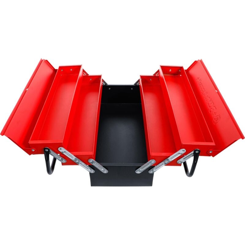 Realizzato in lamiera di acciaio con 2 manici versione robusta adatto per es. per inserti in schiuma morbida EVA dei set di attrezzi dell'articolo BGS 6056 Numero di scomparti: 5 4 scomparti, dimensione interna: 460 x 95 x 45 mm 1 scomparto, dimensione interna: 455 x 190 x 30 mm Peso del tessuto 4.3 Dimensioni dell'imballaggio 1 Peso lordo 4300 g