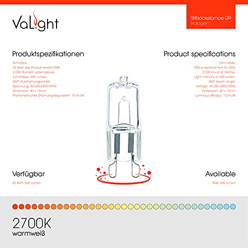 VaLight Confezione da 5 lampadine con attacco bispina, 42 W, G9, 220 - 240 V, 40 mm, luce bianca calda, dimmerabile, sostituisce 56 W, lampadine alogene con attacco bispina