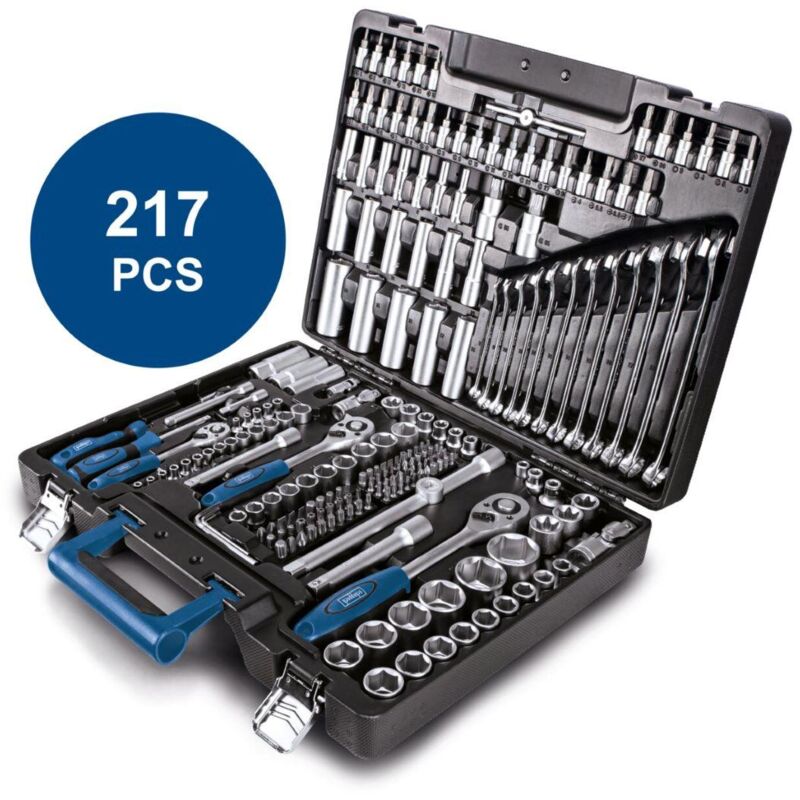 VALIGIA CON UTENSILI ATTREZZI E ACCESSORI 217 PZ SCHEPPACH TB217 Un kit di attrezzi compatto pieno di strumenti di avvitatura di alta qualità e ben disposti, inclusi 3 cricchetti con prolunghe, chiavi, chiavi a brugola, cacciaviti con portainserti, vari bit e chiavi a tubo. Con la valigetta Scheppach TB217, sarai ben attrezzato per qualsiasi lavoro. Gli utensili sono realizzati in acciaio al cromo-vanadio e acciaio per utensili, e sono quindi particolarmente resistenti e durevoli. • Kit di attrezzi stabile e compatto • Tutti i pezzi riposti in modo sicuro e a portata di mano • Trasmissione ad alta potenza e quindi, dadi o viti Allen possono essere allentati facilmente • Nessun serraggio eccessivo • Utilizzabile anche in luoghi di difficile accesso grazie alle varie dimensioni e accessori • 217 pezzi di utensili di alta qualità in acciaio CV e acciaio per utensili: 39 bussole 18 bussole lunghe 14 bussole e-socket 3 bussole per candele 3 snodi universali 1 leva a T scorrevole 3