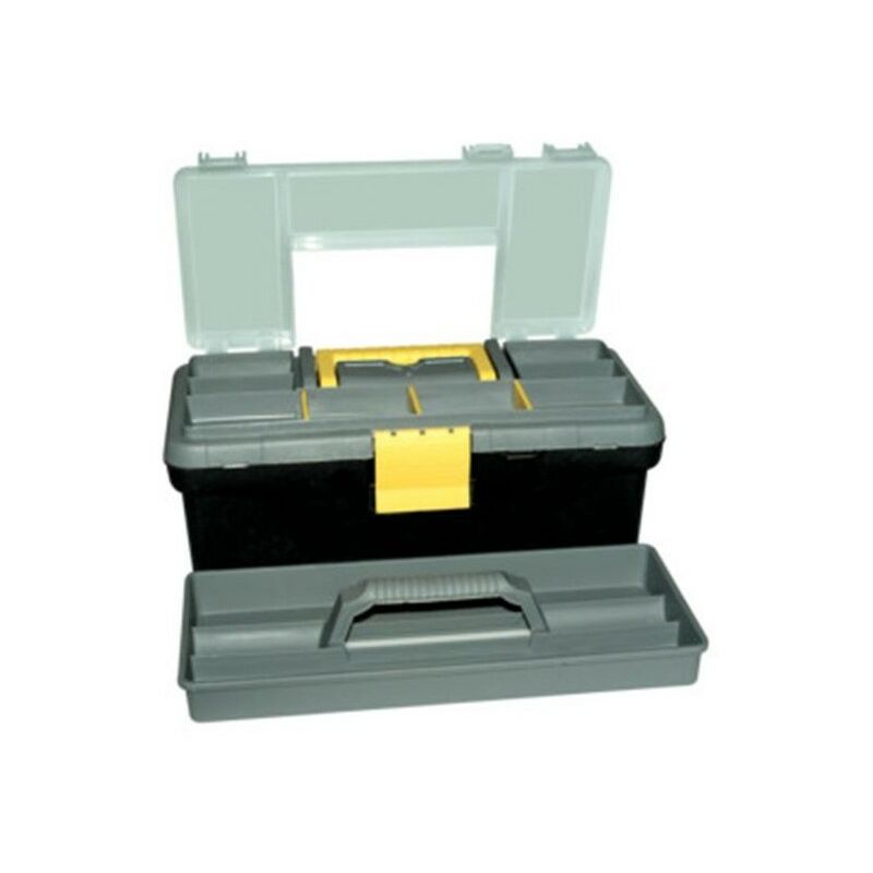 Valigia porta attrezzi con porta minuterie. Pratica maneggevole, dispone nella parte alta di 4 divisori fissi e di 3 divisori asportabili, adatti a qualsiasi minuteria. All'interno ha un ulteriore vano porta oggetti asportabile. Maniglia a scomparsa. Materiale: Abs Colore: nero/grigio Dimensioni: 315X175X130
