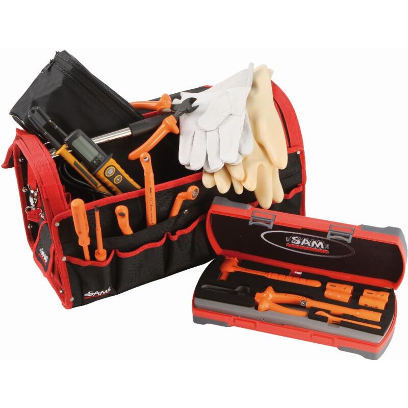 Dettagli: Set di 8 utensili isolati da 1000V, guanto e sovraguanto di protezione, 1 verificatore di assenza di tensione, 1 borsa isolata, 3 chiavi contrangolo, 2 cacciaviti, 1 tagliafili, custodia in tessuto. 4 x ZJH-...1000V 3/8 prese corte isolate 10 - 11 - 12 - 13 mm 1 x ZJ-159 Cricchetto 3/8 isolato 1000V 1 x ZJ-210 / ZJ-215 Chiavi di prolunga 3/8 isolate 1000V 1 x Z-10-10 1000V Chiave aperta isolata da 10 mm 1 xZ-239-20 Pinza a becchi ricurvi isolata 1000V 1 x Z-421-A3 Guanti isolati in lattice 1 x Z-421-A9 Guanti di protezione in silicone crispin 1 x 913-VAT Tester di tensione e continuità 3 x Z-105-10 / Z-105-12 / Z-105-13 Chiavi poligonali contrangolo isolate 1000V 1 x Z-153-M10 1000V cacciaviti isolati per viti con intaglio 1 x Z-173-M2 1000V cacciavite isolato per viti Phillips 1 x Z-233-16P Taglierina diagonale isolata 1000V 1 x BAG-2N Cassetta per attrezzi tessili 30L