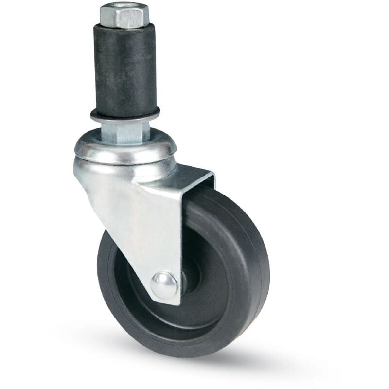 Ruota per arredamento,supporto in acciaio stampato zinco-cromato,attacco a tassello ad espansione in gomma d.18 mm. Ruota in gomma sintetica nera d.60x23 mm,nucleo in materiale termoplastico. Portata kg.50 (dinamica). Altezza mm.88.