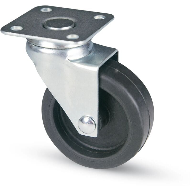 Ruota per arredamento,supporto in acciaio stampato zinco-cromato,piastra girevole mm.60x60. Ruota in gomma sintetica nera d.60x23 mm,nucleo in materiale termoplastico. Portata kg.50 (dinamica). Altezza mm.88.