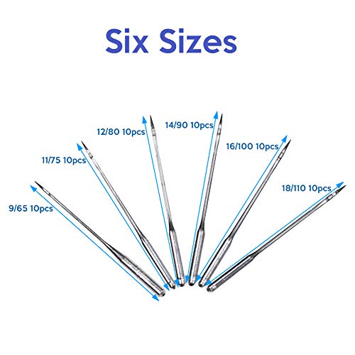 Dettagli del prodotto: il modello di aghi per macchina da cucire è HAX1 e include diverse dimensioni: 9/65, 11/75, 12/80, 14/90, 16/100, 18/110, 10 pezzi per taglia e 6 taglie in un set .
