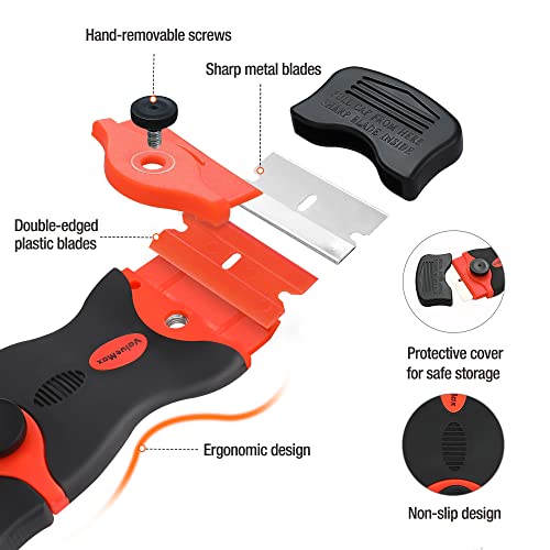 【Sicuro da usare】Ogni raschietto per vetro ha una solida manopola di bloccaggio per il rinforzo strutturale e un funzionamento stabile. Entrambe le teste di taglio sono dotate di guaine protettive in plastica per proteggerti da tagli accidentali. Per sicurezza, le lame sono conservate in una scatola di plastica