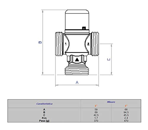 In funzione della temperatura in ingresso, la valvola devia in modo proporzionale ed automatico l'acqua tra le uscite 1 e 2 indicate sul corpo: per temperature inferiori a 48°C verso la porta 1, per temperature maggiori verso la 2.