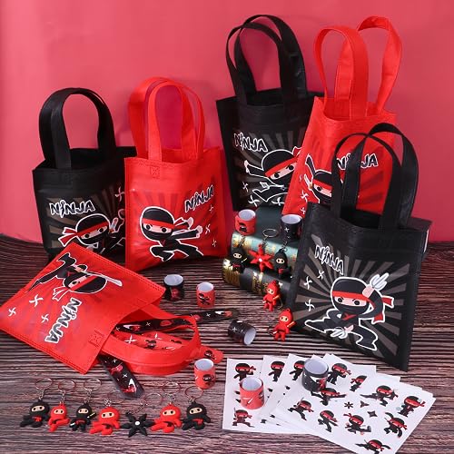 【Gadget Ninja Compleanno Bambini】 Include 12 borse tote in tessuto non tessuto a tema Ninja, 12 portachiavi Ninja, 12 braccialetti Slap Ninja e 12 adesivi a tema Ninja, soddisfano tutte le esigenze della tua festa a tema ninja.